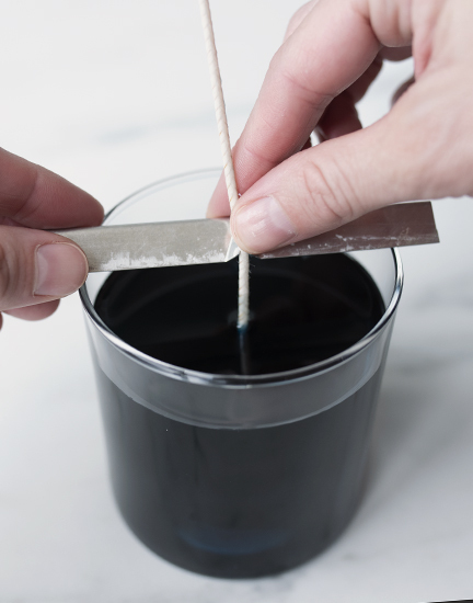 When the wax cools to 160°F (71°C), carefully pour the wax into the jars. Secure the wick with a wick bar.