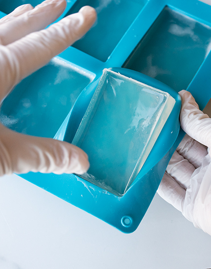Allow soap bars to cool completely before unmolding. Invert the mold and apply light pressure to the center of the cavity. If the bars do not come out easily, allow them to cool longer, or stick the mold in the refrigerator for up to 30 minutes and try again.